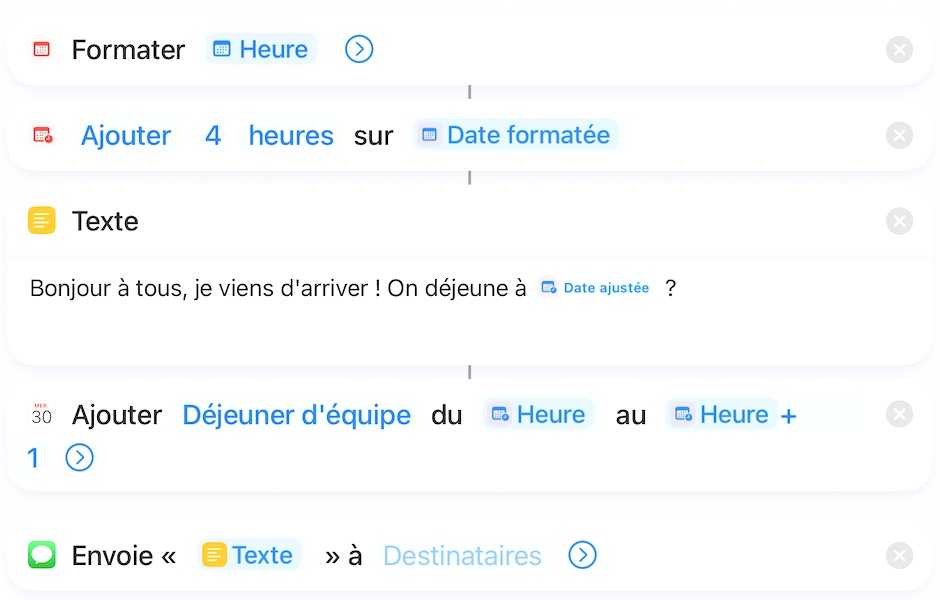 Résultat : un raccourci qui, lorsque vous arrivez au bureau, envoie un message à votre équipe avec l’heure d’arrivée et planifie automatiquement votre pause déjeuner.