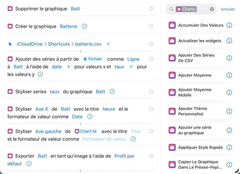 Charty est disponible sur l’App Store. Une fois installée, elle ajoute une série d’actions dans Raccourcis, comme :